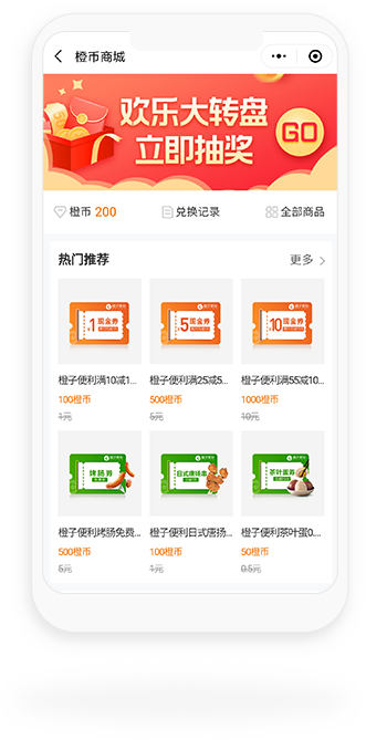 案例内容:为橙子便利搭建积分商城,支持自有商品积分兑换,策划多种积分活动,实现拉动新会员、留住老会员的用户运营目标,提高效果的同时挖掘足够的曝光量。